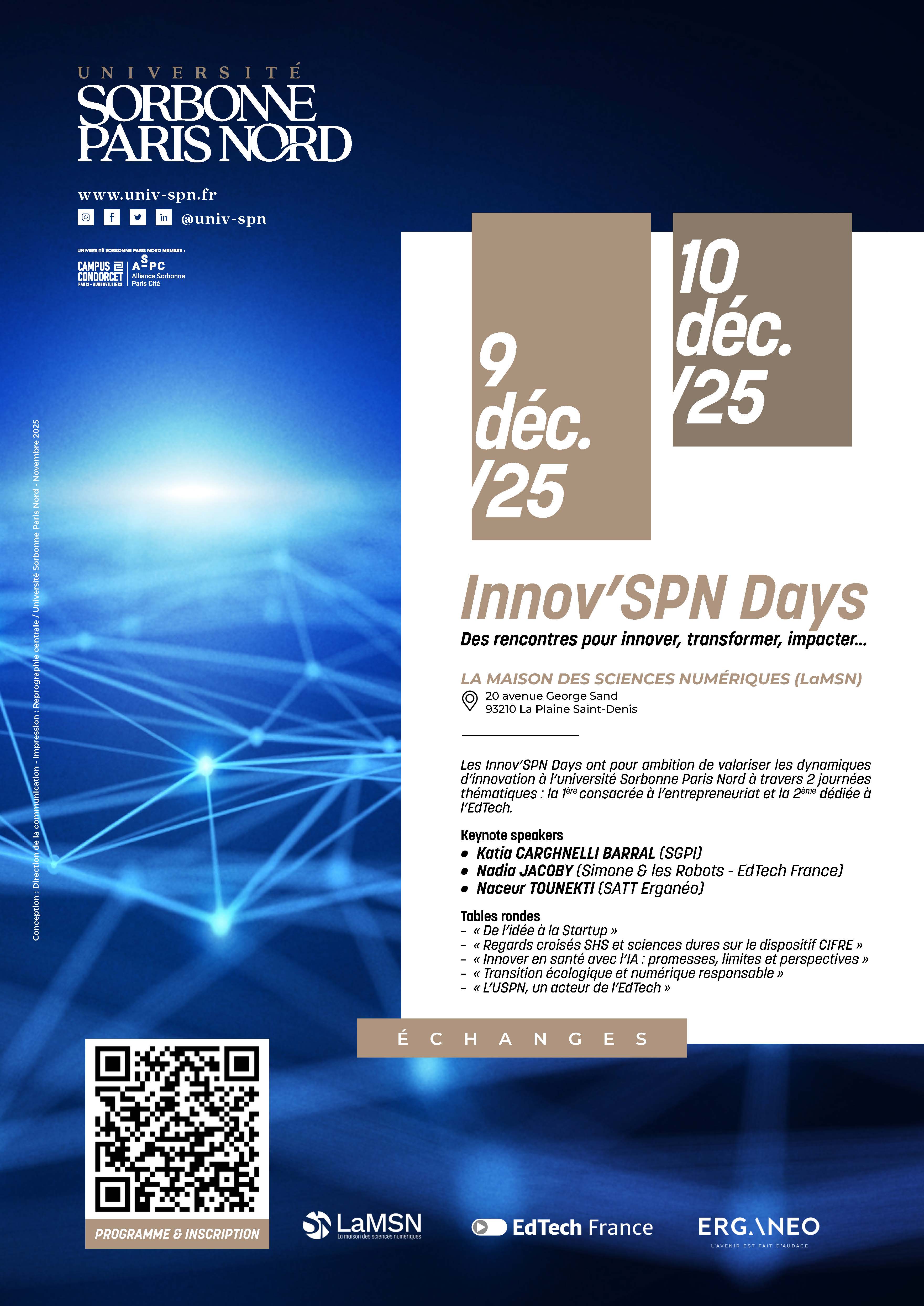 Les Innov’SPN Days ont pour ambition de valoriser les dynamiques d’innovation à l’université Sorbonne Paris Nord (USPN) à travers deux journées thématiques. La première journée sera dédiée à l’entrepreneuriat, à la valorisation de la recherche et au transfert d’innovation. La seconde journée, sera consacrée à l'EdTech.